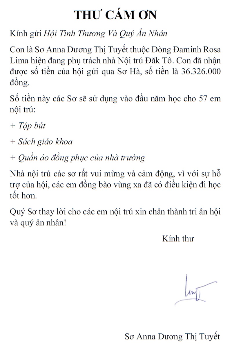 Thư cảm ơn của Sr Anna Dương Thị Tuyết (nhà Nội trú Đăk Tô)