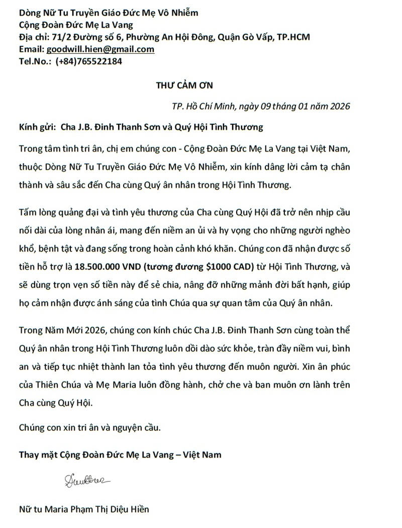 Thư cảm ơn của Sr Maria Phạm Thị Diệu Hiền (Dòng Nữ Tu Truyền Giáo Đức Mẹ Vô Nhiễm)