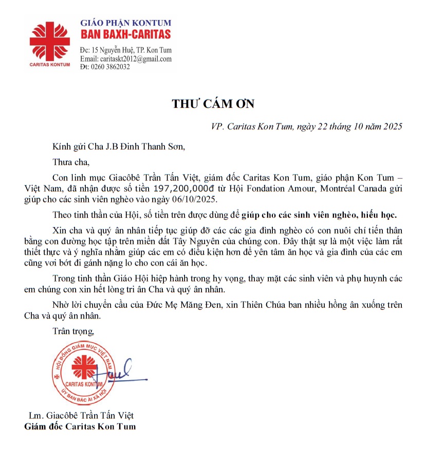 Thư cảm ơn của Lm. Giacôbê Trần Tấn Việt (Caritas Kon Tum)