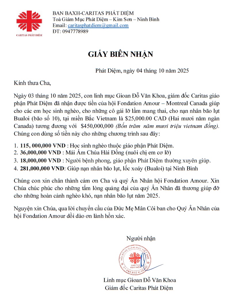 Thư cảm ơn của Lm. Gioan Đỗ Văn Khoa (Caritas Phát Diệm)