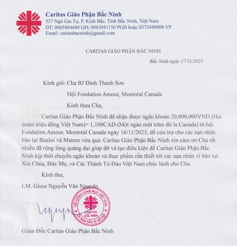Thư cảm ơn của Lm. Giuse Nguyễn Văn Nguyên (Caritas Giáo Phận Bắc Ninh)
