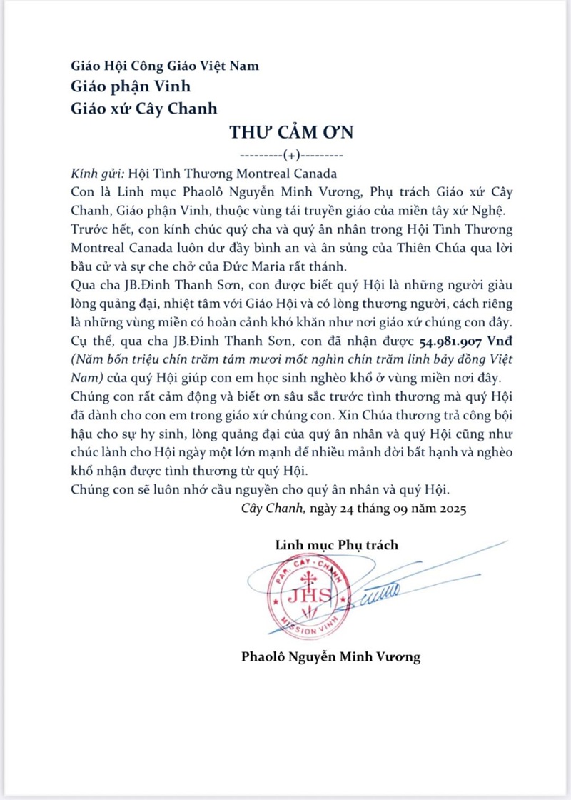 Thư cảm ơn của Lm. Phaolô Nguyễn Minh Vương (Giáo xứ Cây Chanh)