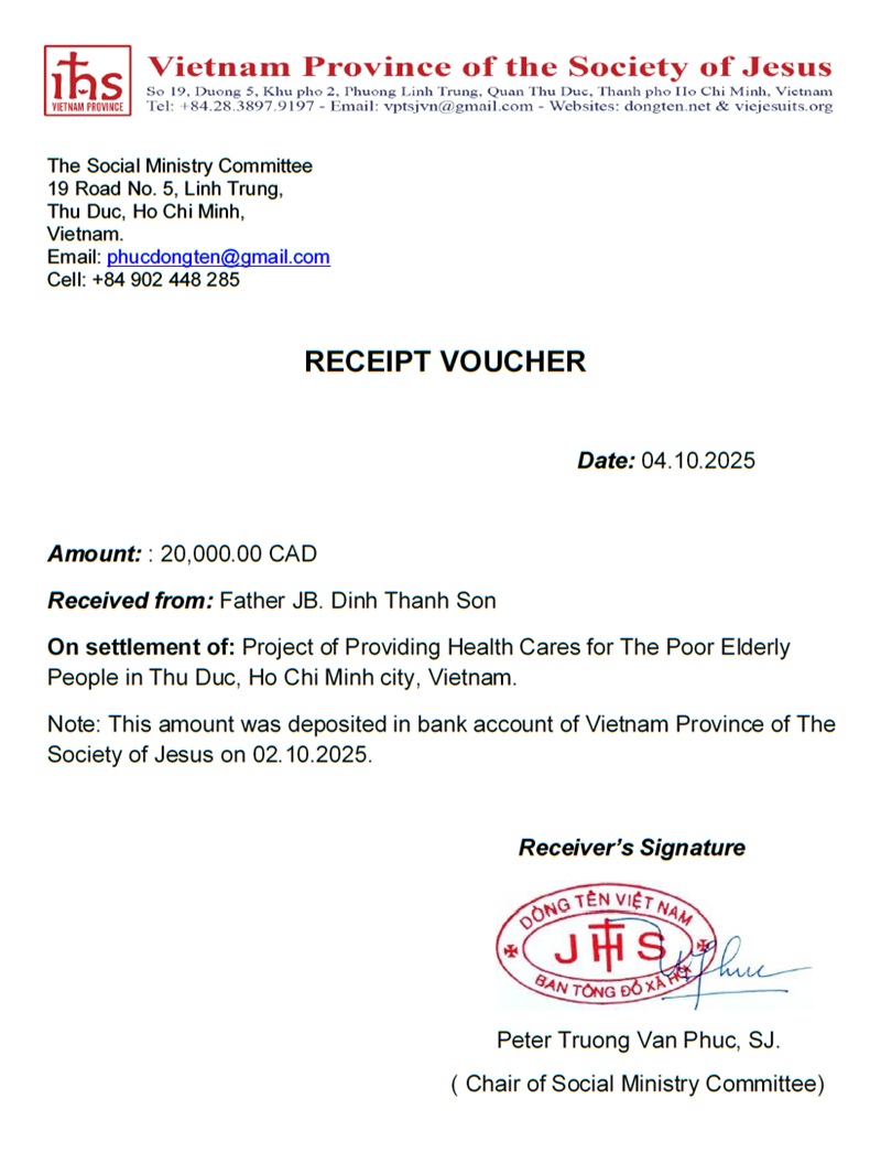 Ghi chú: Số tiền này đã được chuyển vào tài khoản ngân hàng của Tỉnh Dòng Tên Việt Nam vào ngày 02.10.2025.