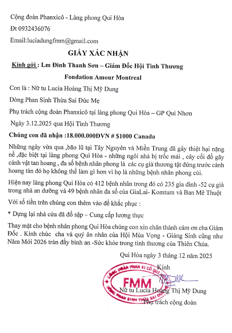Thư cảm ơn của Sr Lucia Hoàng Thị Mỹ Dung (Cộng đoàn Phanxicô - Làng phong Qui Hòa)