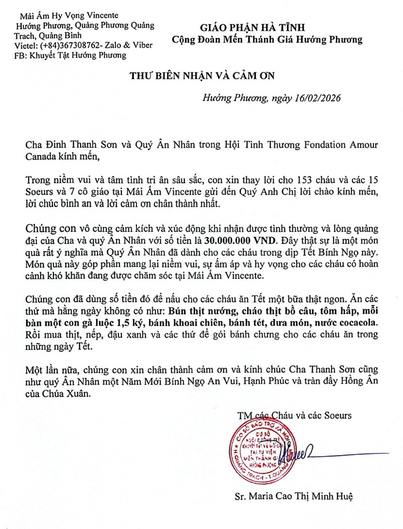 Thư cảm ơn của Sr Maria Cao Thị Minh Huệ 02-2026 (Mái Ấm Hy Vọng Vincente)