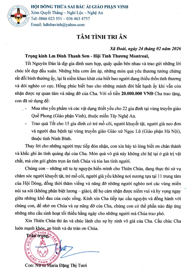 Previous article: Thư cảm ơn của Sr Maria Đặng Thị Phúc, 02-2026 (Trung tâm mồ côi, khuyết tật Mẹ Teresa Calcutta, Giáo phận Vinh)