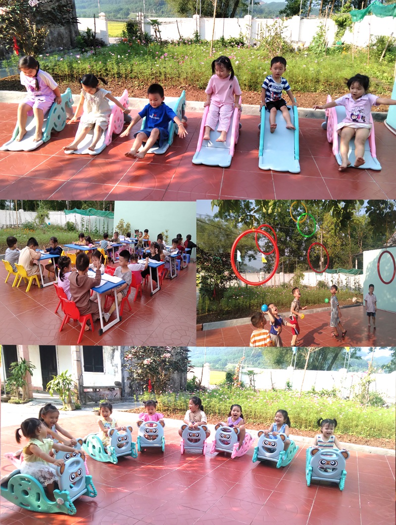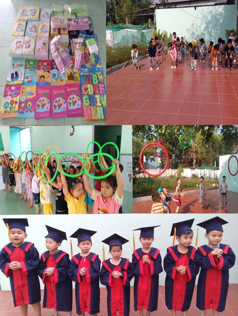 - Mua các đồ dùng và đồ chơi như sau: bàn ghế, bảng đen, vòng tập thể dục, đồ chơi bóng rổ, bóng to nhỏ, 7 bộ áo ra trường, đồ chơi lắp ghép, đồ chơi âm nhạc, đồ chơi hai chiều (cầu trượt để ngược thành bập bênh).