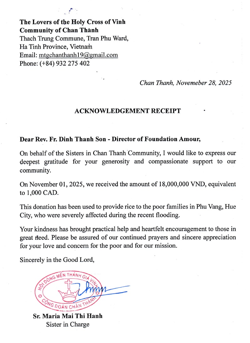 Thư cảm ơn của Sr Maria Mai Thị Hạnh (Hội Dòng Mến Thánh Giá Vinh, Cộng Đoàn Chân Thành)