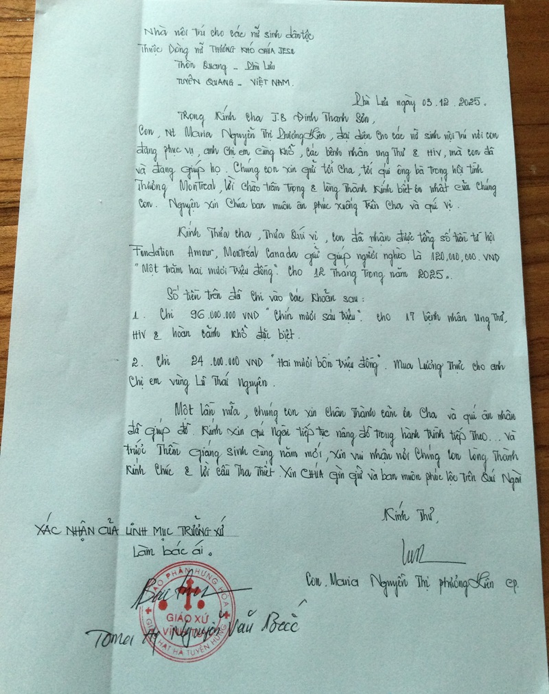 Thư cảm ơn của Sr Maria Nguyễn Thị Phương Liên (Nhà nội trú cho các nữ sinh dân tộc)