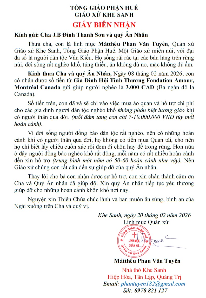 Thư cảm ơn của Lm. Mátthêu Phan Văn Tuyên (Giáo Xứ Khe Sanh, Hiệp Hòa, Tân Lập, Quảng Trị)